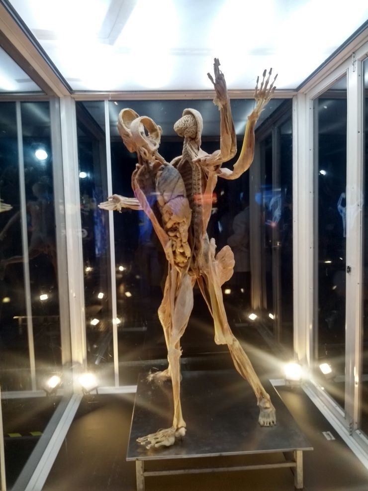 Esos cuerpos, corresponden a personas asiáticas, que vivieron en China y que fueron donados y son completamente reales, excepto los ojos porque es muy difícil de conservar por la técnica de plastinación, sólo hay uno auténtico en la sala del sistema nervioso.