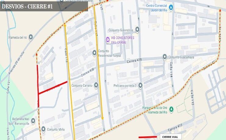 La Secretaría Distrital de Tránsito y Seguridad Vial informa a la ciudadanía que se ha programado un cierre temporal en un sector de Alameda del Río, desde este lunes 24 de noviembre hasta el 31 de diciembre por trabajos de instalación de redes de drenaje de aguas lluvias, en los tramos de la calle 120 entre carreras 42B y 43, y carrera 42B entre calles 120 y 118.