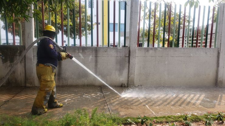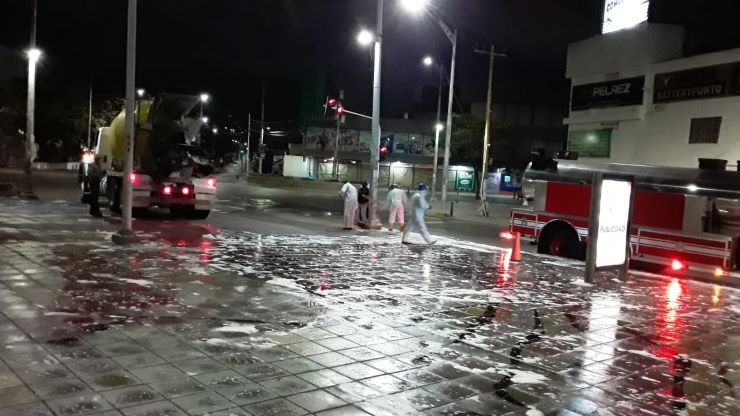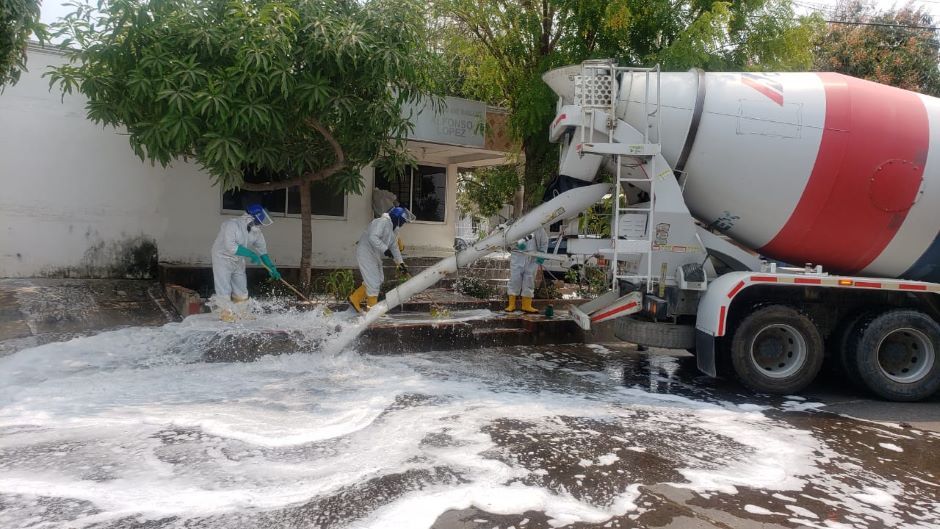 Para la limpieza se están usando los camiones de Cemex y Ultracem, encargados de distribuir el jabón, y los del Cuerpo de Bomberos que con las mangueras a alta presión terminan el lavado. Para la desinfección se usa hipoclorito de sodio.